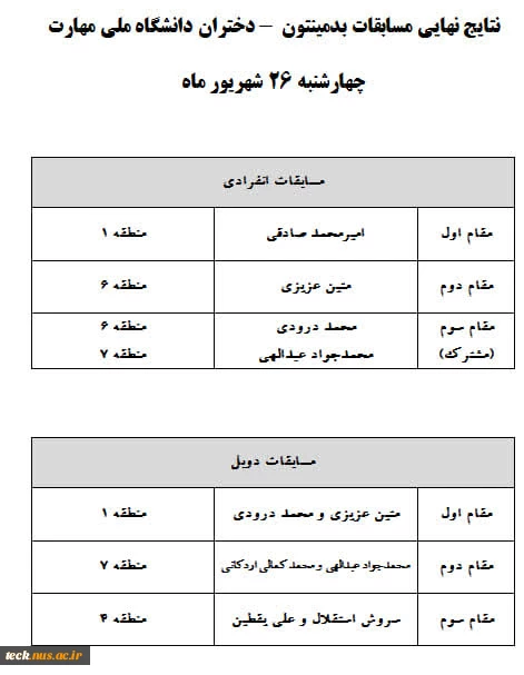 امتیاز دهید : نتیجه نهایی مسابقات بدمینتون ،مسابقات دوومیدانی انفرادی،مسابقات دوومیدانی تیمی،کشتی آزادو کشتی فرنگی المپیاد پسران 2 پنجشنبه 27 شهریور 1404 ساعت 13:16